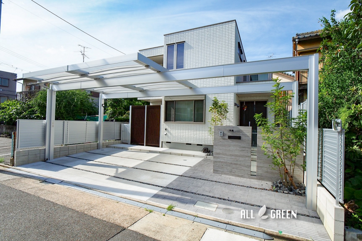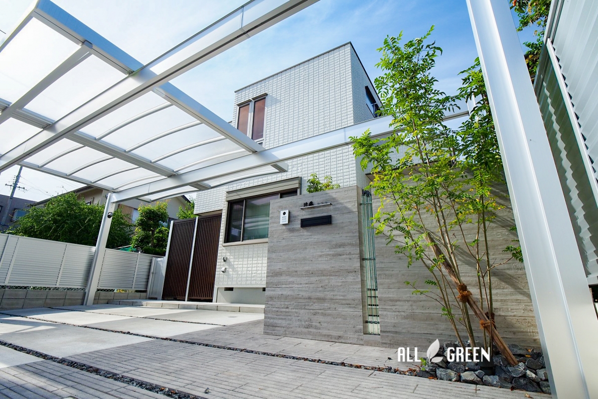 屋根は駐車スペースのみにかかる片側寄せの屋根で柱はアプローチの向こう側まである敷地めいっぱいの場所に設置。