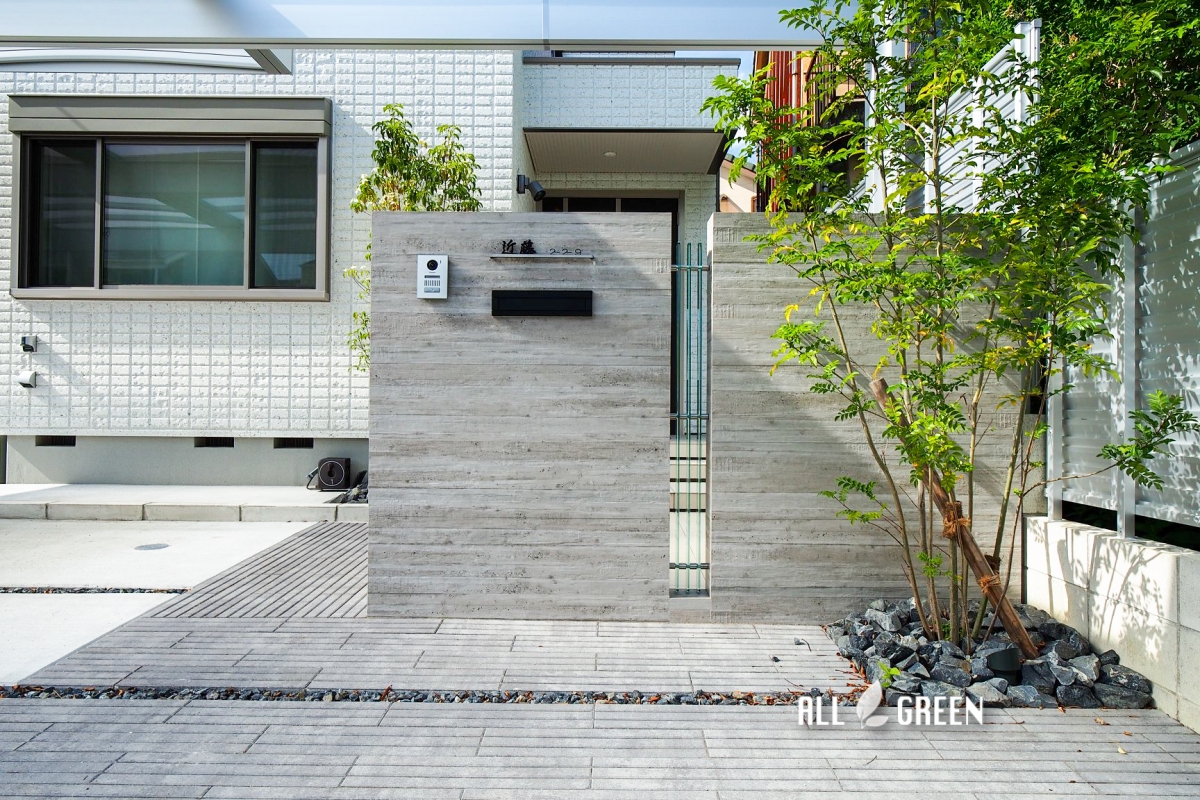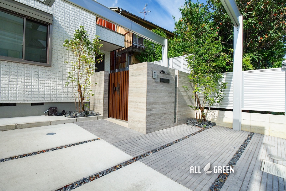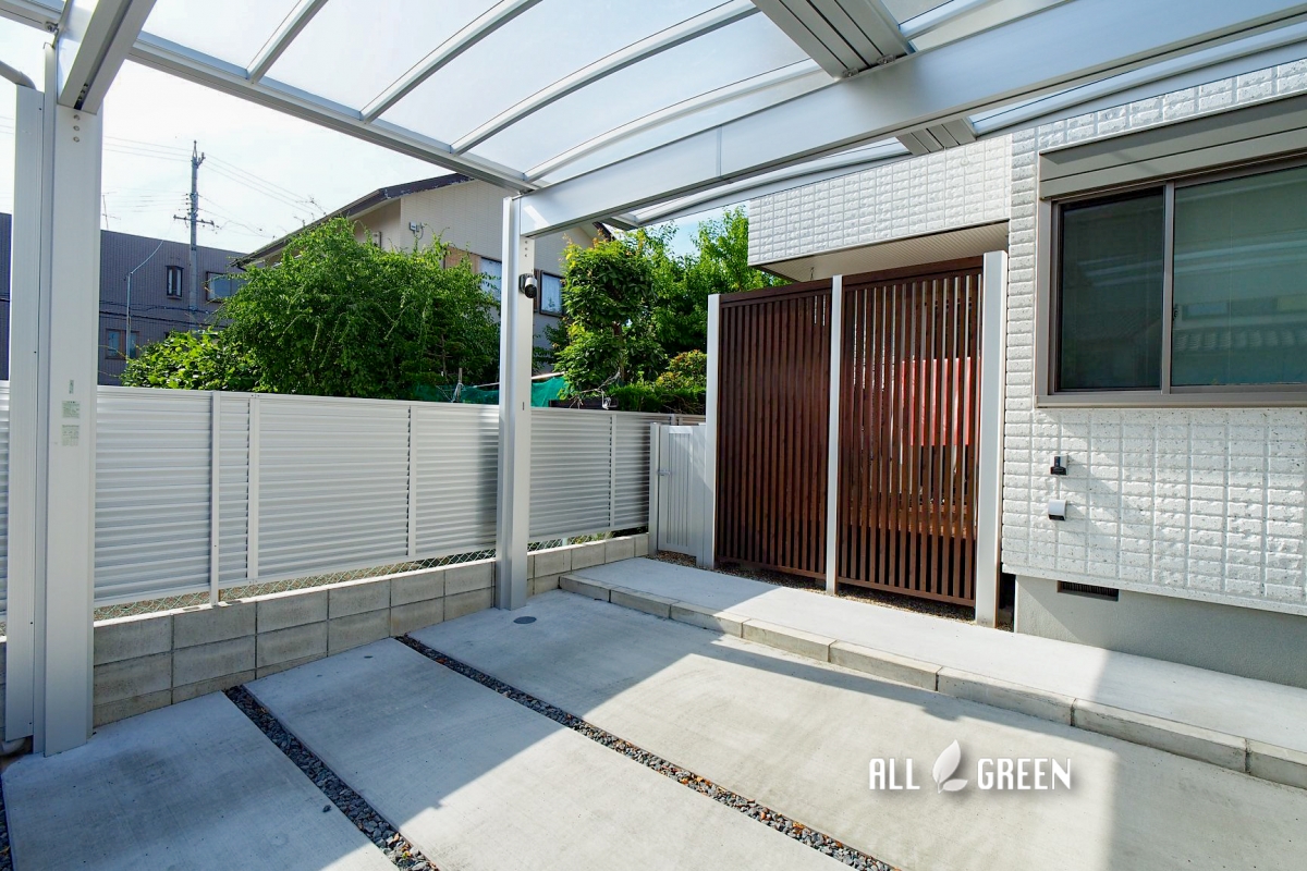 門扉と同じ木調のスクリーンでナチュラル感を演出しています。