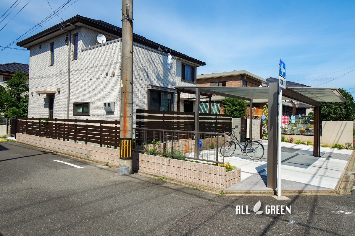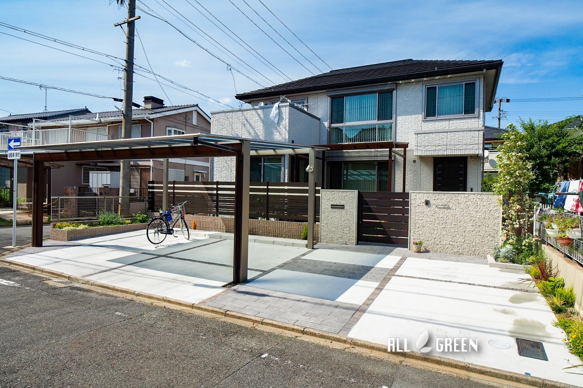 アルミ製品を全体的に木調色で統一させたデザインの外構は生活のしやすい落ち着く空間となりました。