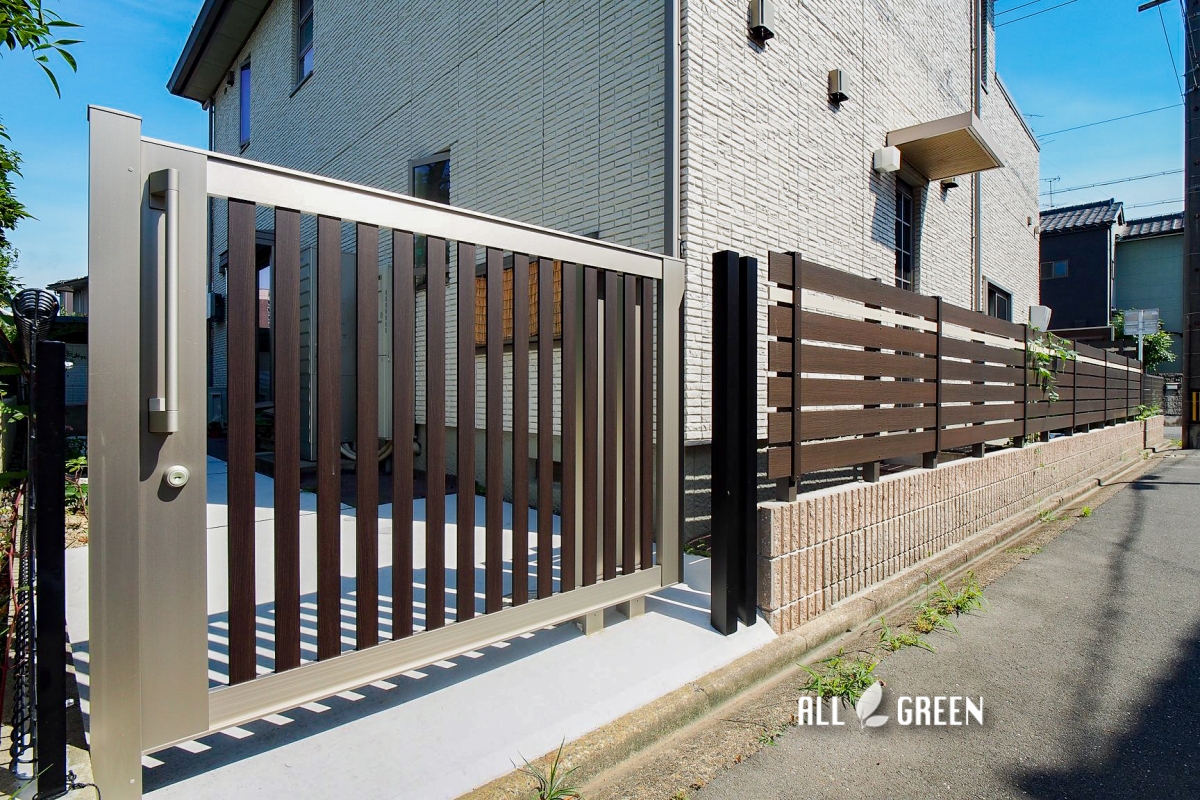アーバンフェンスは板の枚数や隙間、そして豊富なカラーバリエーションからお好みの色を選ぶことができるというオリジナリティと個性が溢れるフェンスで、お施主様の選ばれたカラーはダークブラウンの板に一枚だけアクセントとしてホワイトをいれたお洒落デザイン。普通のアルミフェンスと違って可愛らしい見た目や自分の好きなように加工できるところが女性に人気のフェンスとなっております。