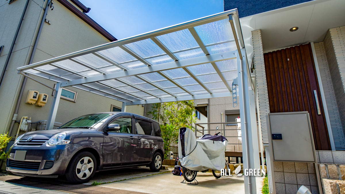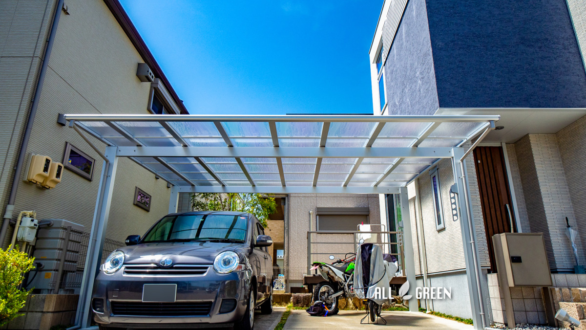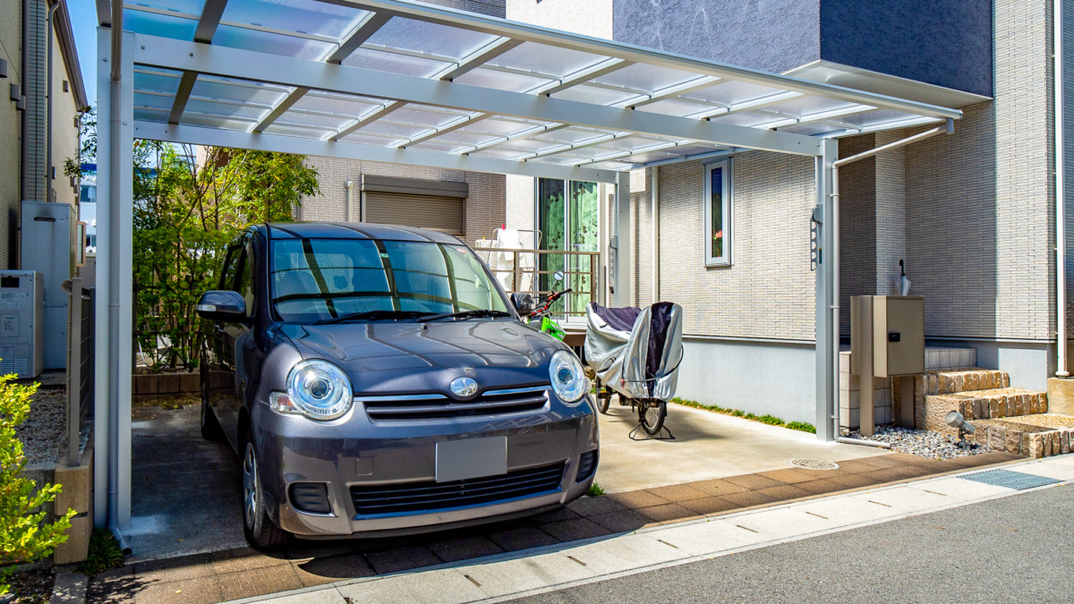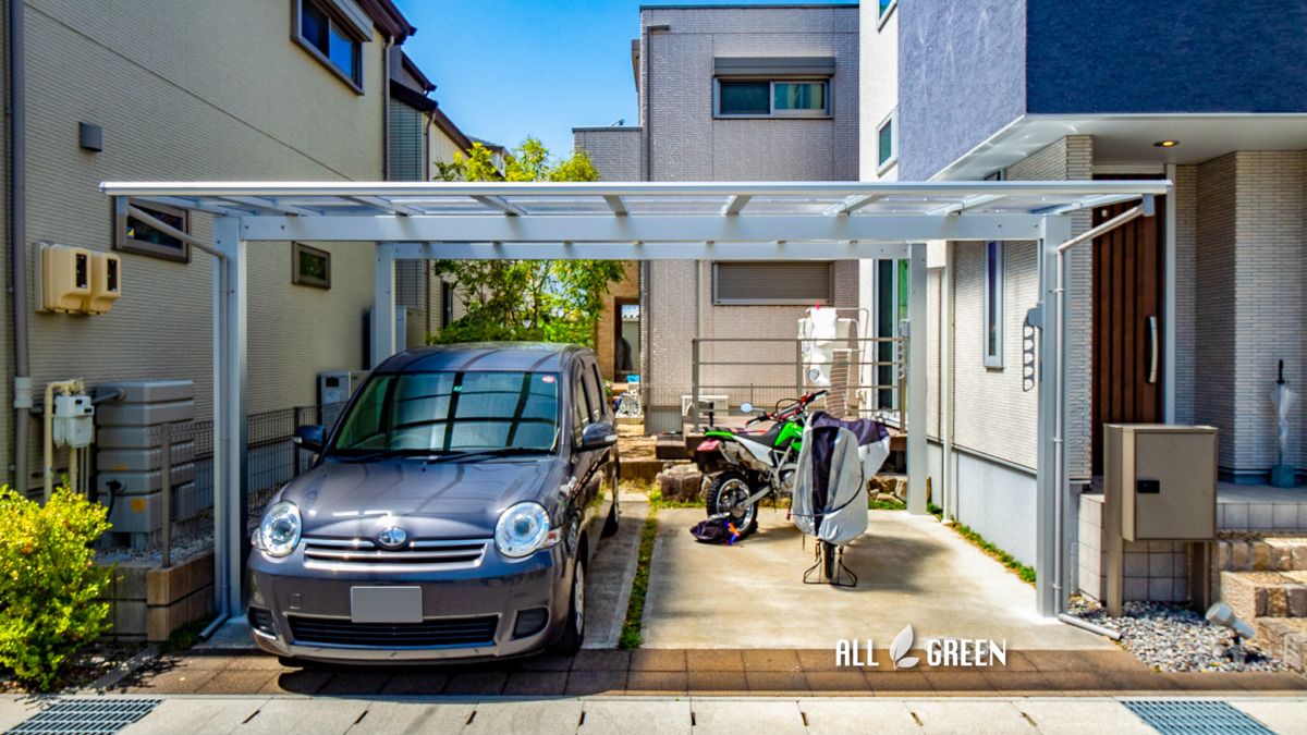 大きなカーポートの屋根で守るのは車だけではありません!二輪車も一緒に守る名古屋市西区のカーポート