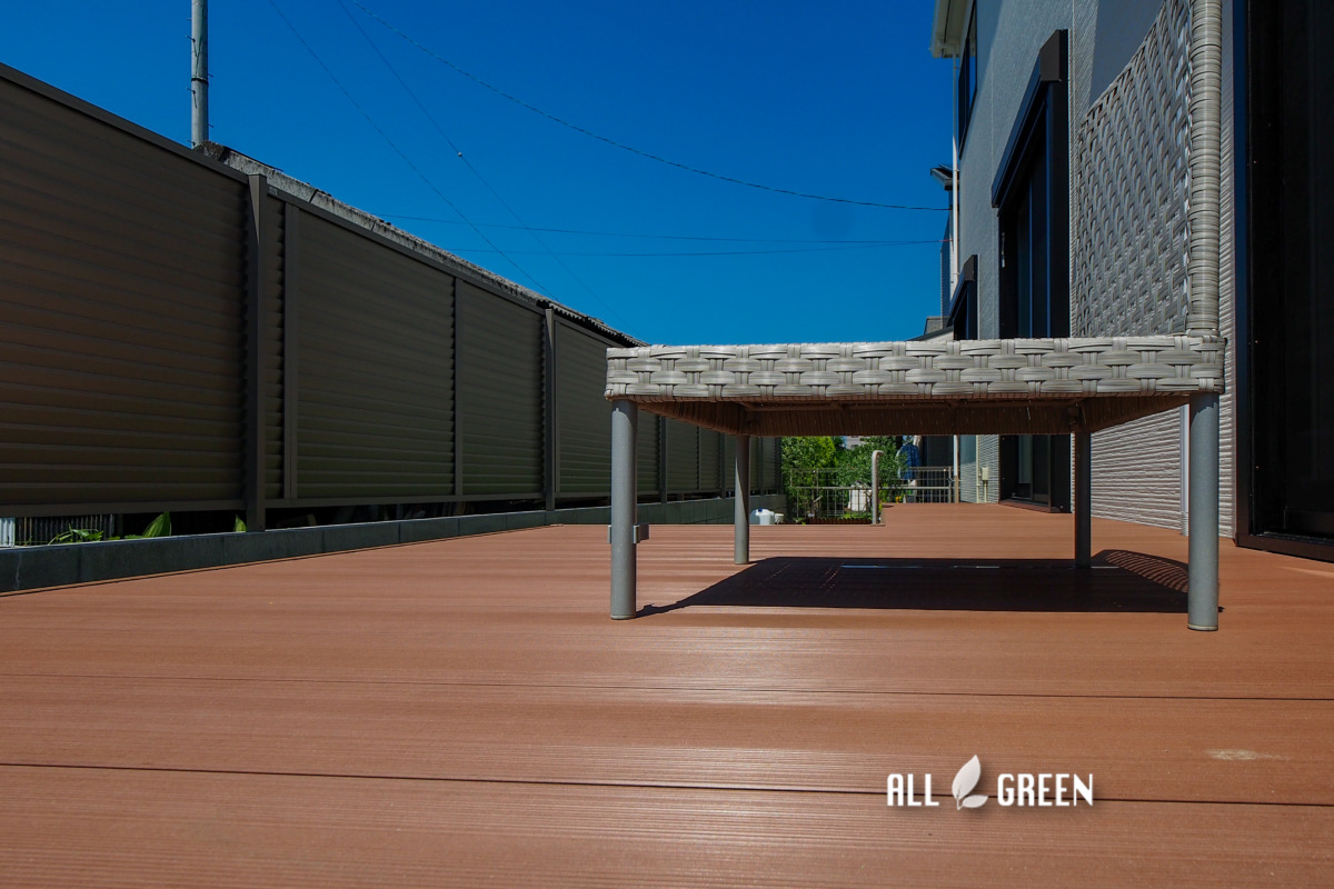 施工したデッキはLIXILの樹ら楽ステージで、猫の侵入が多くデッキ下が不安というご意見もありましたのでオプションにて多段幕板も設置しています。多段幕板は猫などの小動物の侵入が防げるだけでなくデッキを支える束柱も隠してくれるので木箱のように美しい見た目の仕上がりとなります。