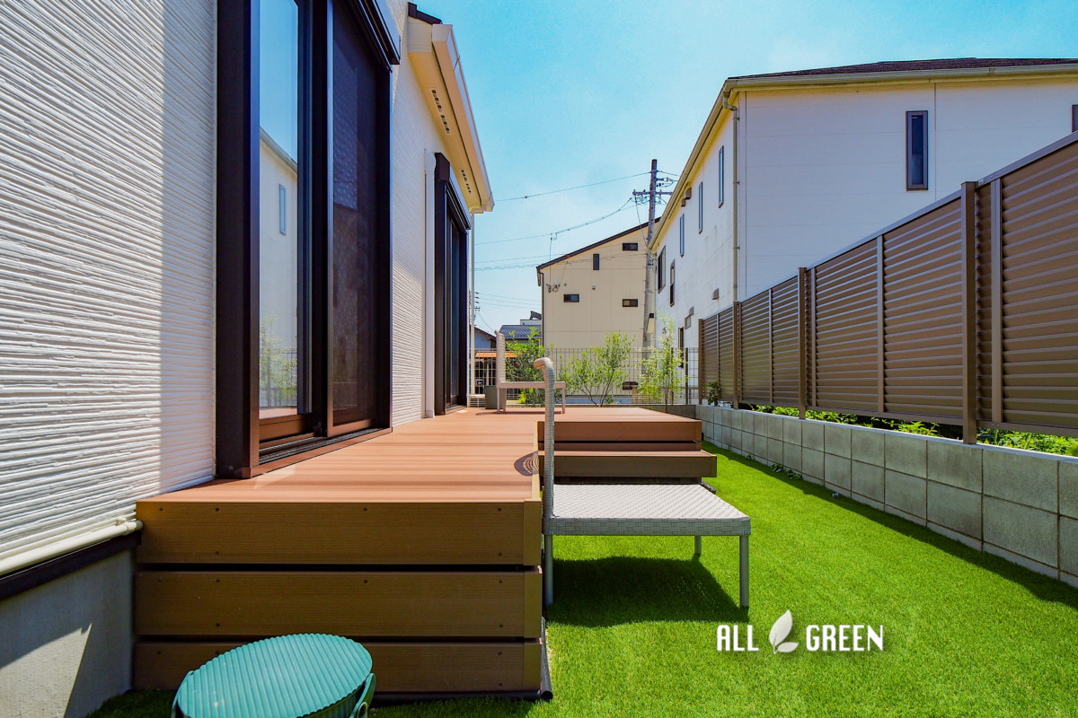 人工芝で遊ぶお子様をウッドデッキから優しく見守れる、そんな温かい空間へと生まれ変わりました。