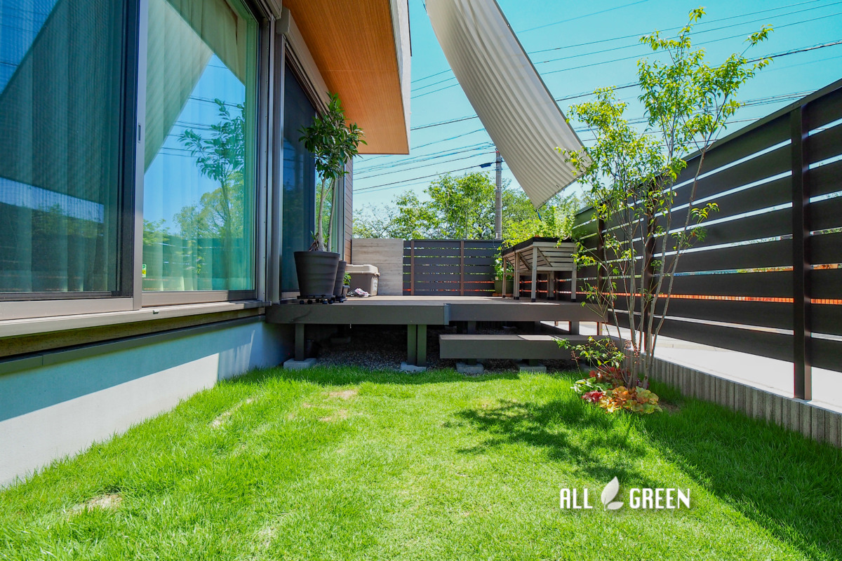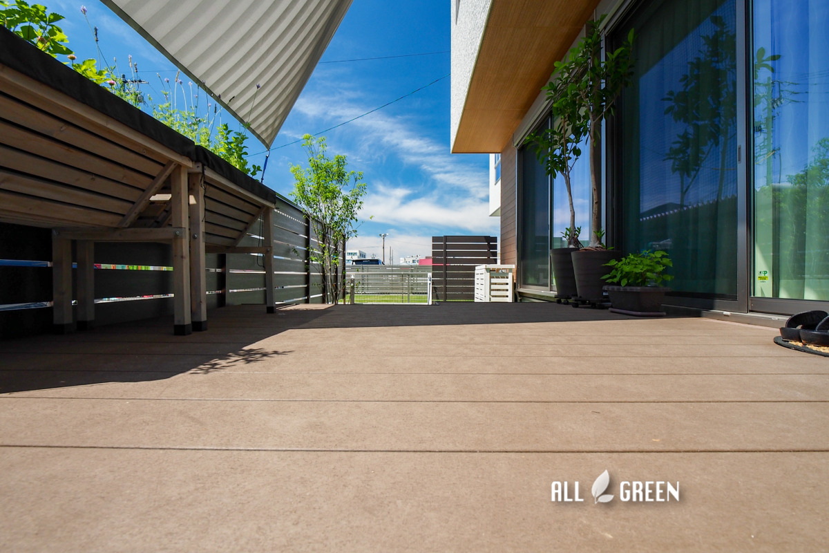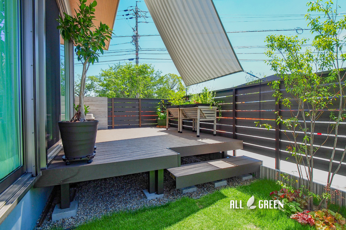 ウッドデッキは掃き出し窓に寄り添う形で施工し、デッキ周りを目隠しフェンスで囲っているため道路面からの視線を気にせずお庭時間を楽しめますね。