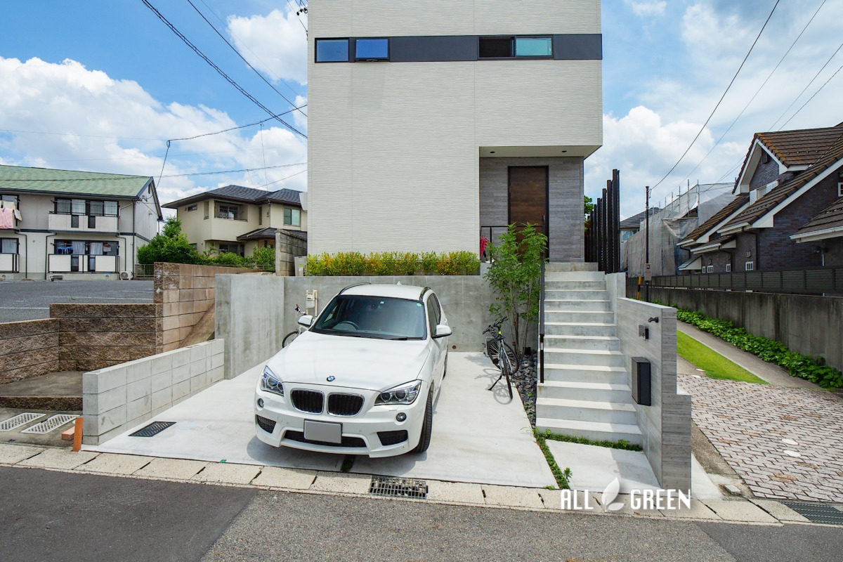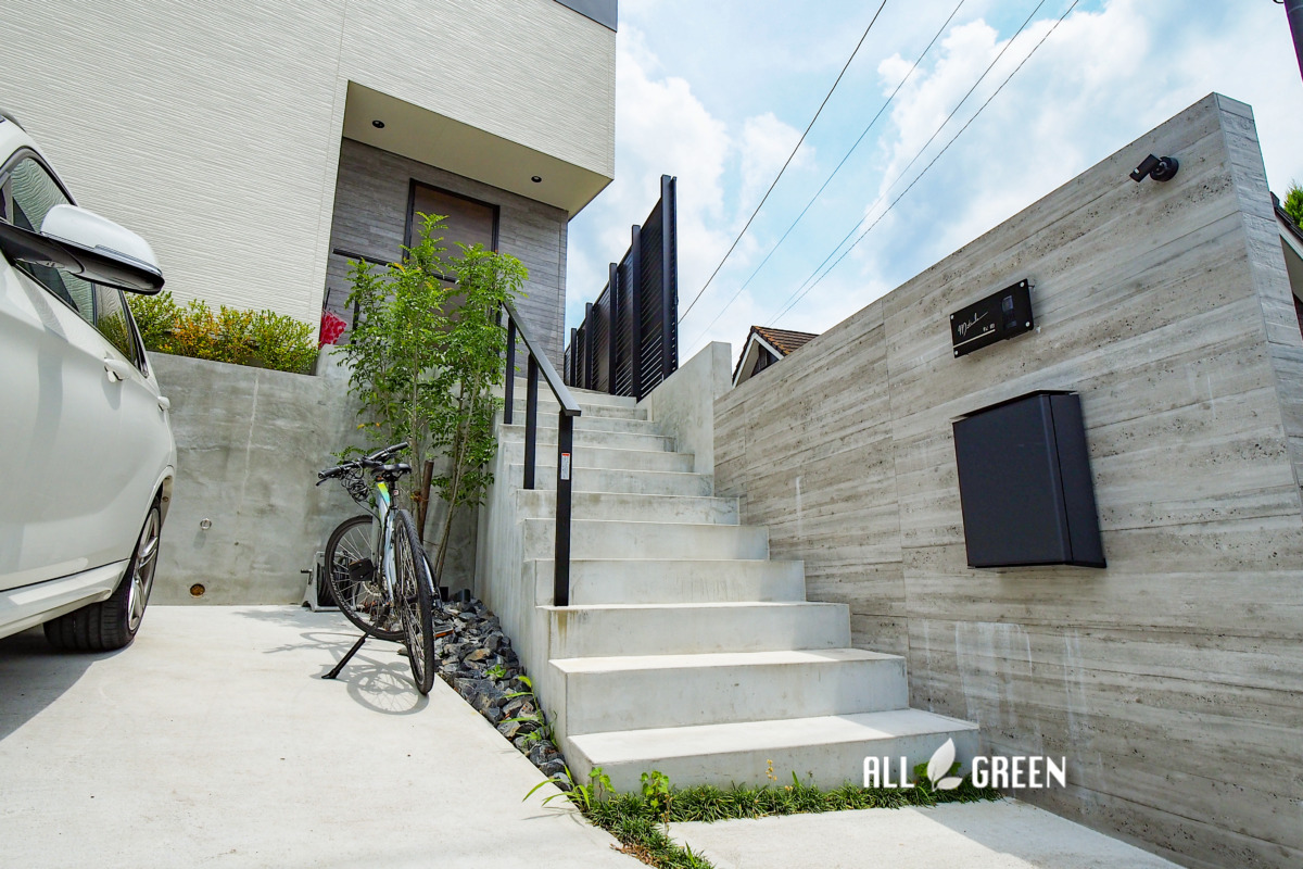 駐車スペースも階段と同じコンクリートで一体感を出し、目地や階段下のスペースには植栽を植え緑をプラス。