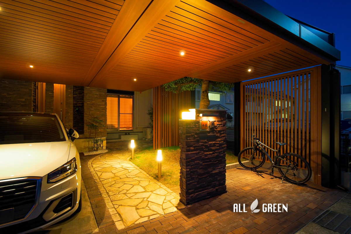 | エクステリア商品 | カーポート:三協アルミ Uスタイルアゼスト 柱/H26(黒) 200Ⅴコンセント設置 屋根/6027×2 6021×1 3018×1(ハフ/オレンジチェリー) 天井材にダウンライト7か所 トランスW35(グレイッシュベージュ) 後方梁の目隠し:Uスタイル用デザイン格子(オレンジチェリー) 35×115/14本 90×115/4本 前方梁の間の格子フェンス:三協アルミ Mグローリア H24(黒) 土間補修:TOYO プリウスブリック・サハラペイブ(サンドダーク) |