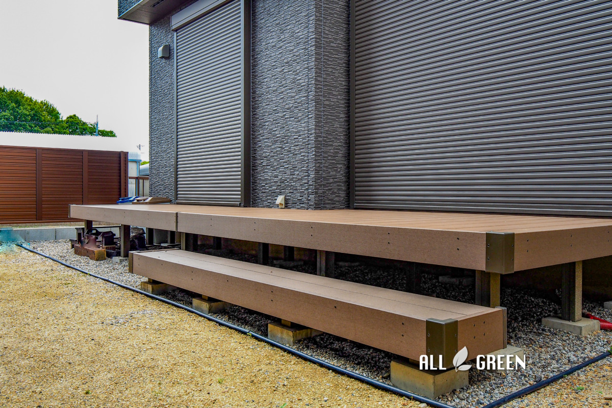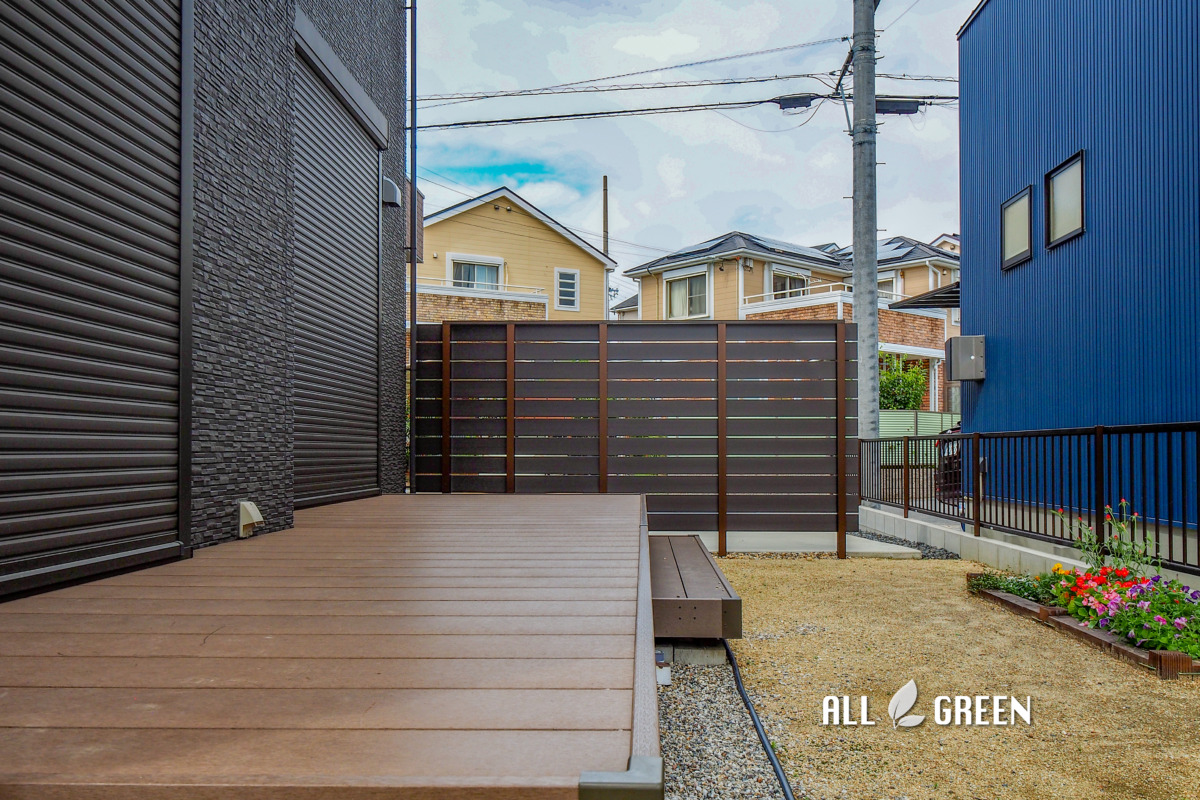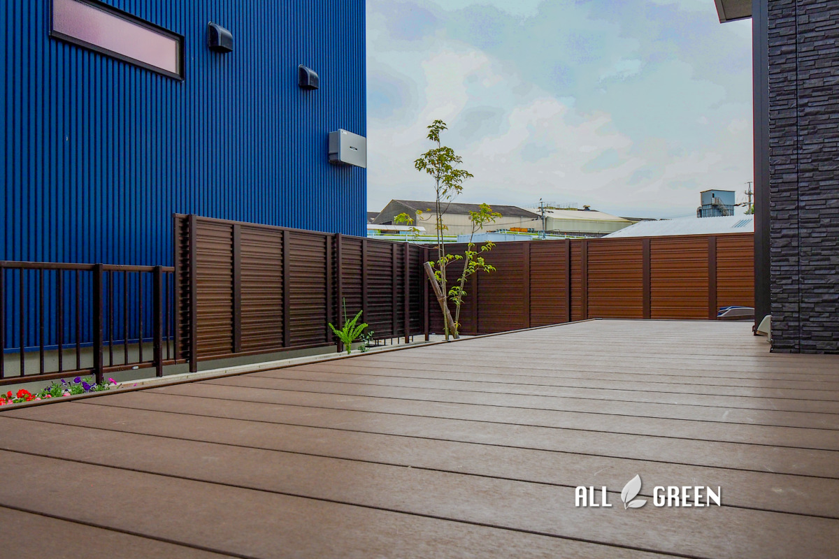 人工木のデッキはB-Life’sのれい樹を設置。れい樹は表面にサンディング加工が施されており、天然木のやわらかい質感を再現し、温かみ溢れるデッキとなっています。