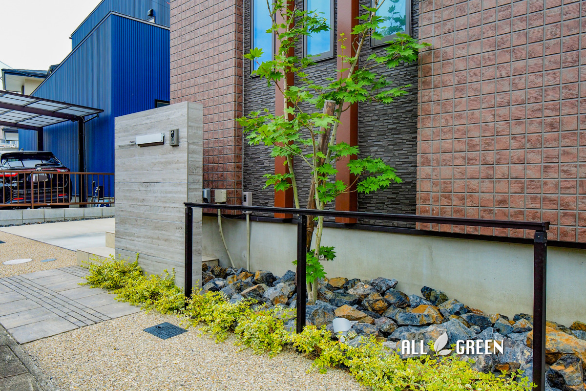門柱横にはシンボルツリーを植え、割栗石を敷き詰めています。