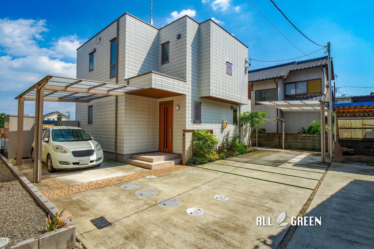 カーポートを2カ所に設けたことでスッキリとしたファサードに。江南市の新築外構