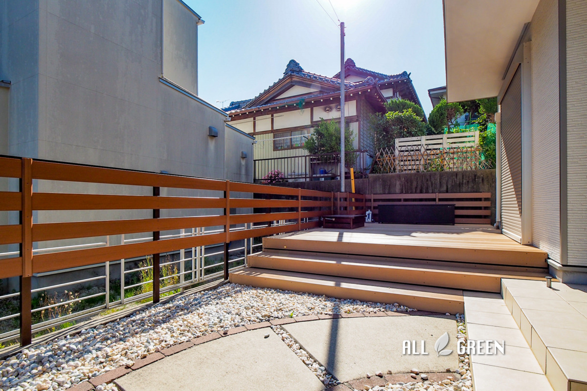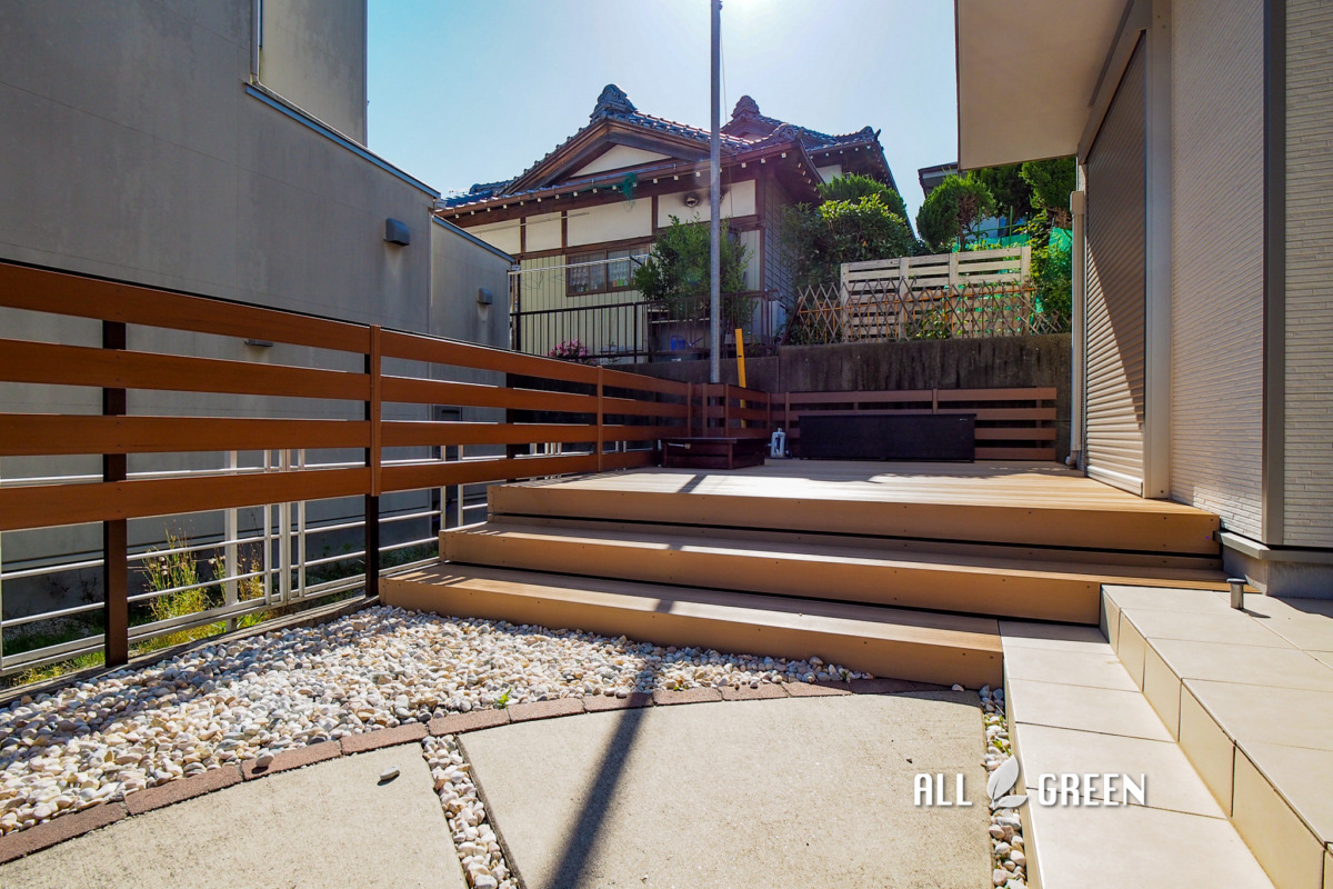 | エクステリア商品 | ウッドデッキ:LIXIL/樹ら楽ステージ木彫(クリエラスクR) 多段幕板+ローデッキ2段 下:川砂利+防草シート フェンス:B-Life.s/Bウッドスタイルベーシック(チークブラウン) 板幅120板4枚 |