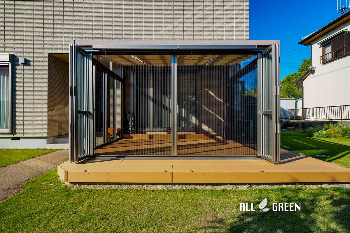 エクステリア商品ガーデンルーム:LIXIL/ガーデンルームGF(正面・左側面:折戸/右側面:テラスサッシ)(デッキ仕様)