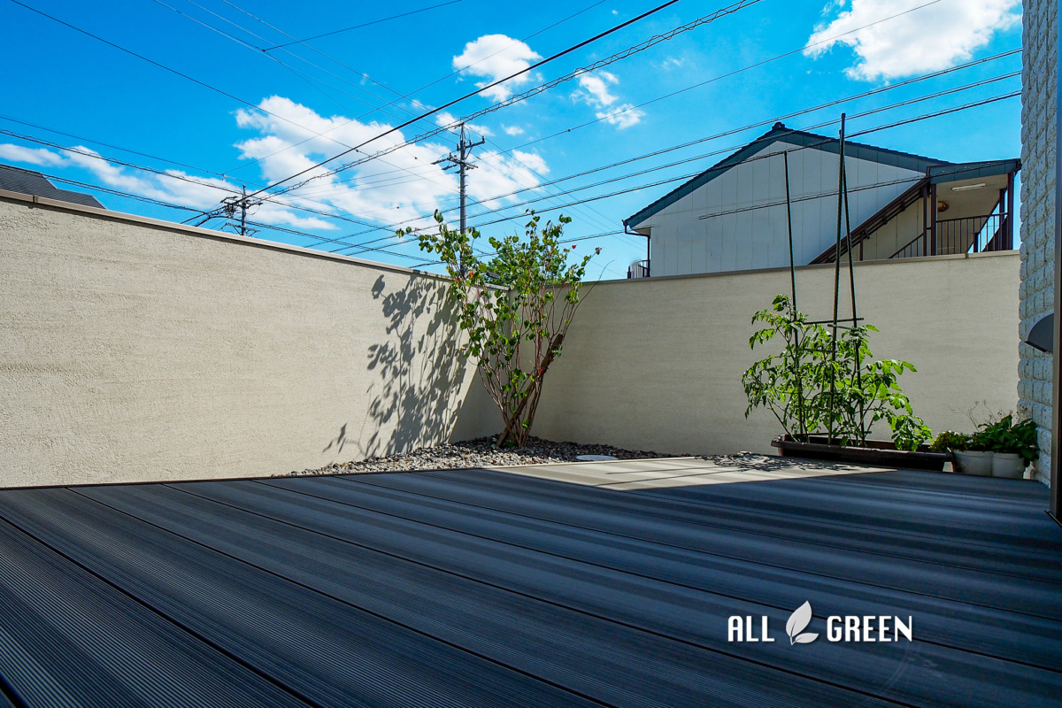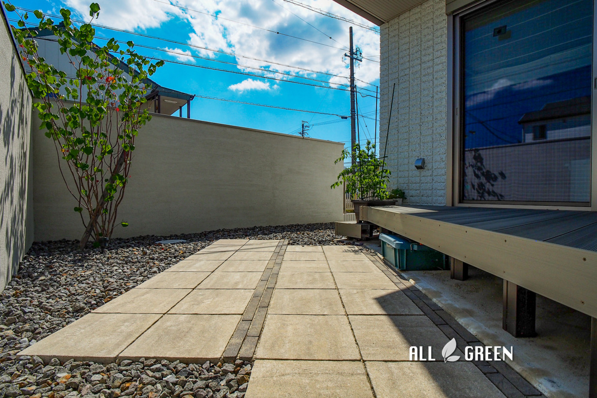 大小異なる形の舗装材を組み合わせ、まわりには単粒砕石を敷き詰めました。メンテナンスが簡単な人工木デッキでゆったりと過ごす時間もいいですね。