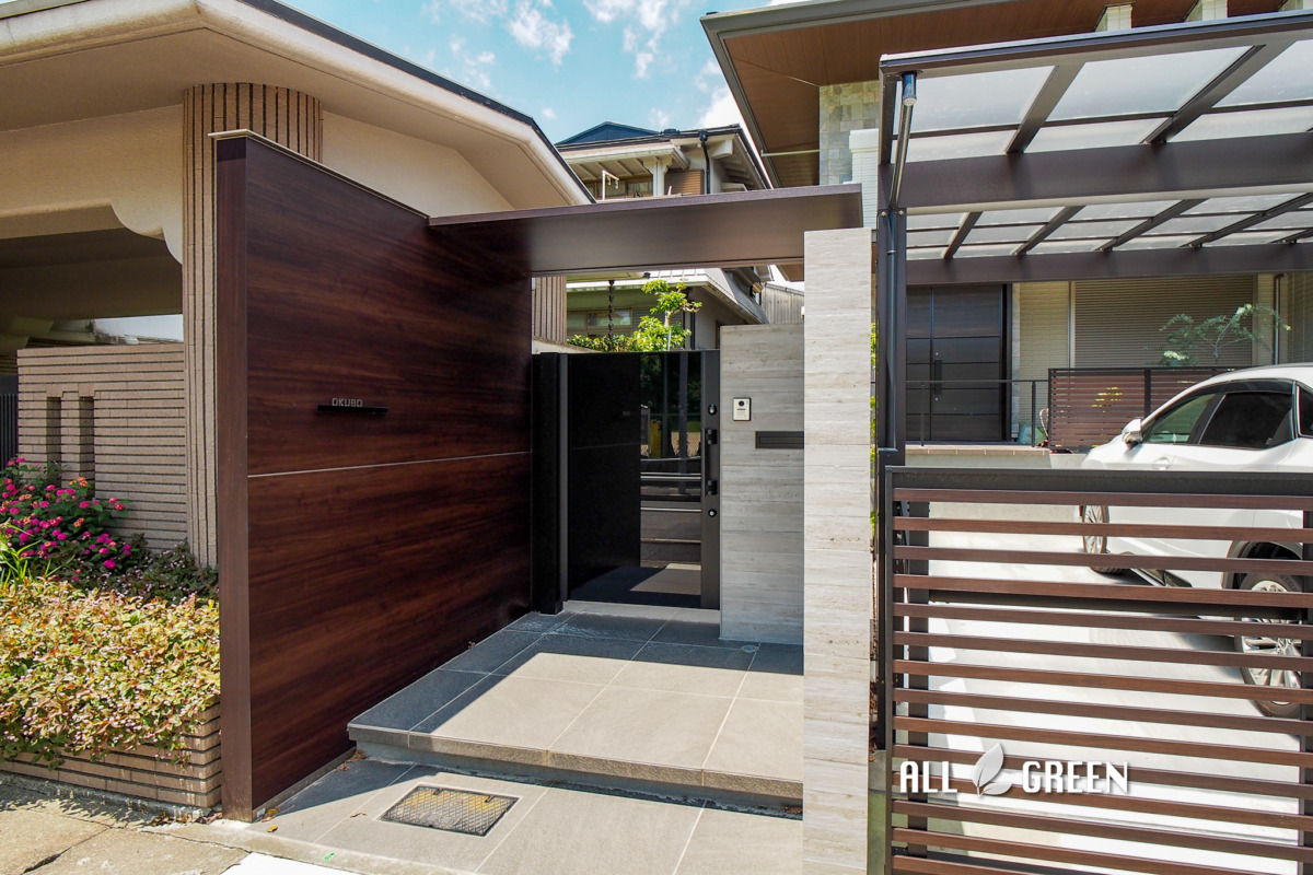 門まわりは木調やグレー、ブラックを使い建物との調和を。