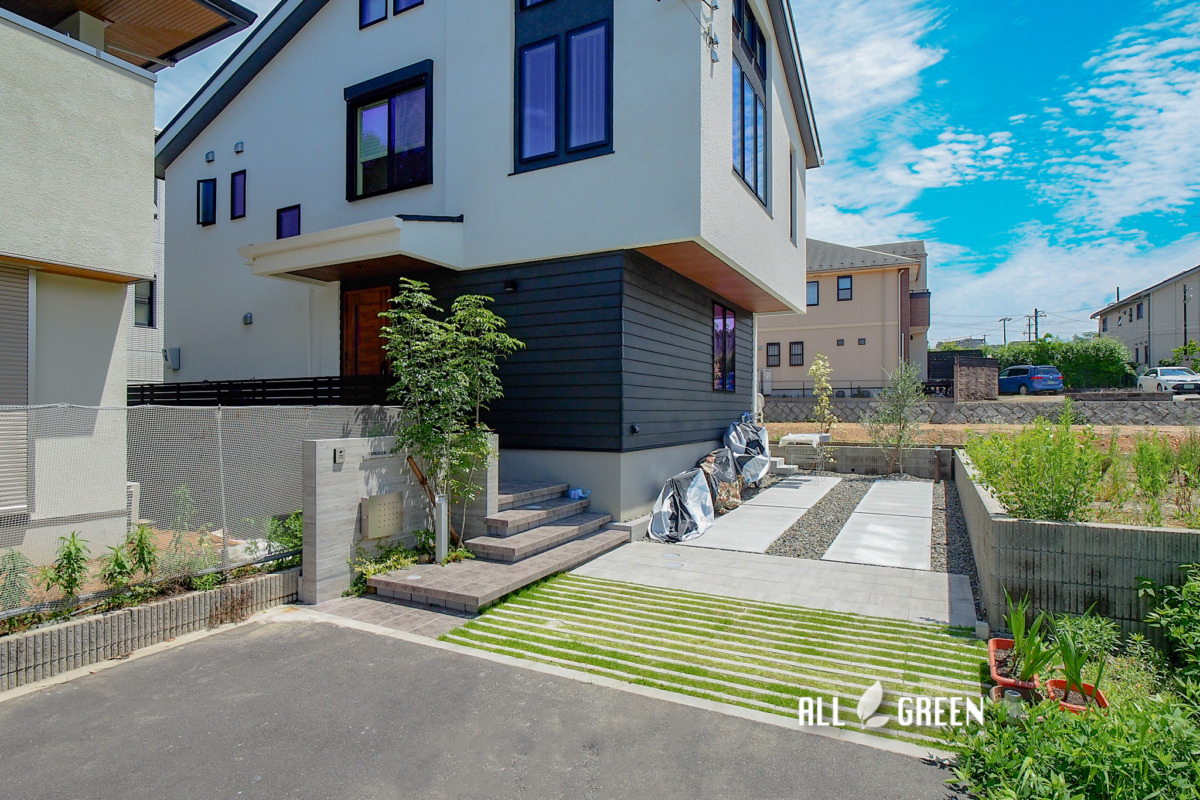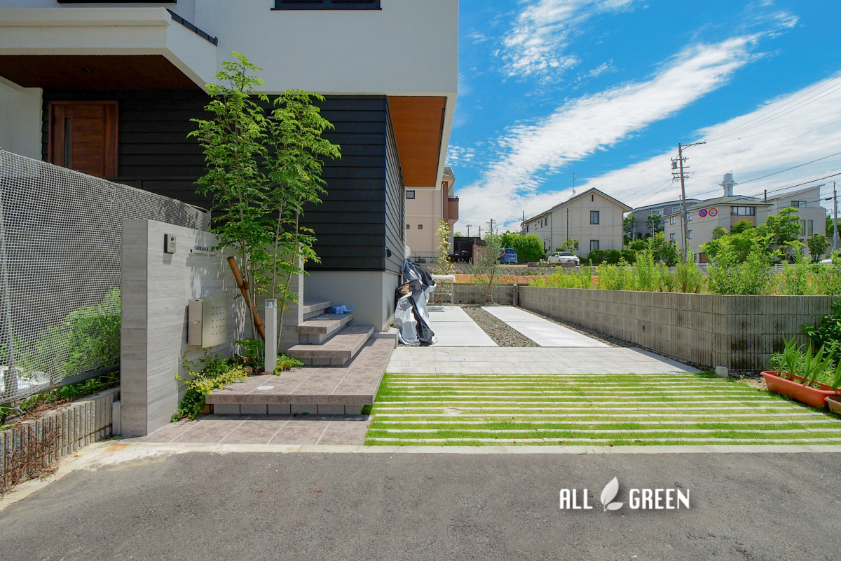 モダンな邸宅に緑を使うことで爽やかな瑞々しい印象を与えるこちらの外構。
