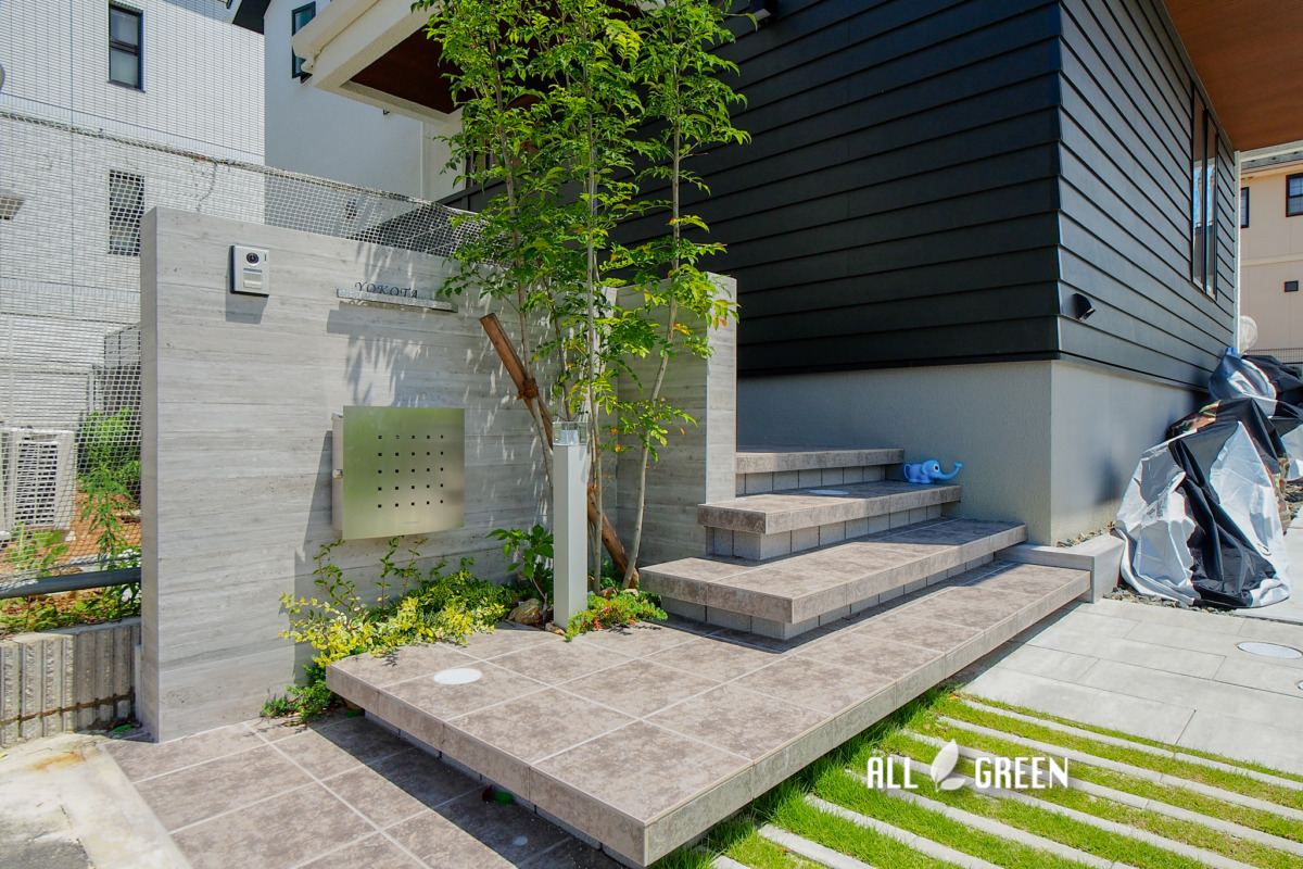 階段横の門塀は杉板目調のタイルでシンプルかつ高級感をプラス。