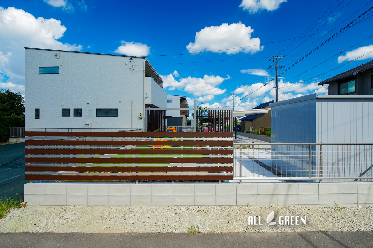 | 外構工事概要 | 稲沢市D様邸新築外構 フェンス、目隠しフェンス、目隠し縦格子、物置、駐車場、芝生、照明、植栽 |