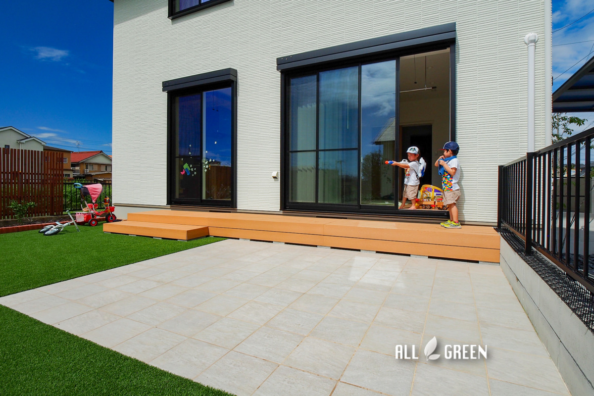 ウッドデッキ手前のタイルテラスも弊社にて施工。