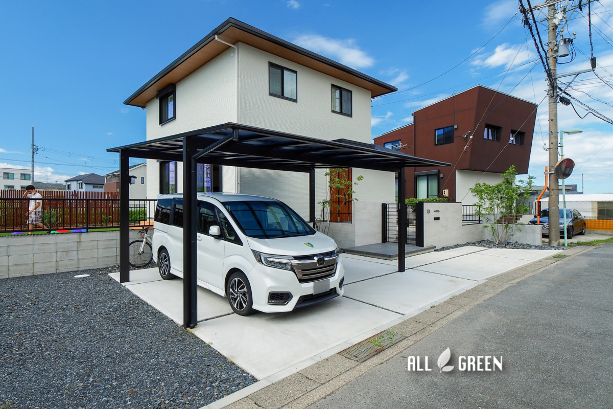 カーポート横に広がっている砕石部分も車が駐車できるスペースになっているので急な来客にも対応できます。来客用駐車スペースはあるととても便利ですね。