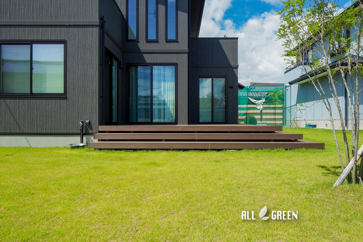 お庭には大きくて立派なウッドデッキと一面に広がる広大な天然芝の姿。