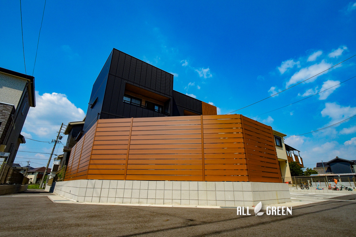カラーは邸宅にアクセントとして取り入れられている木調を意識しチークブラウンを選択。幅広の板+狭い隙間という目隠し効果抜群の組み合わせでいて、明るめの木調カラーで重くなりすぎないナチュラルテイストなお庭空間に仕上げることができました。