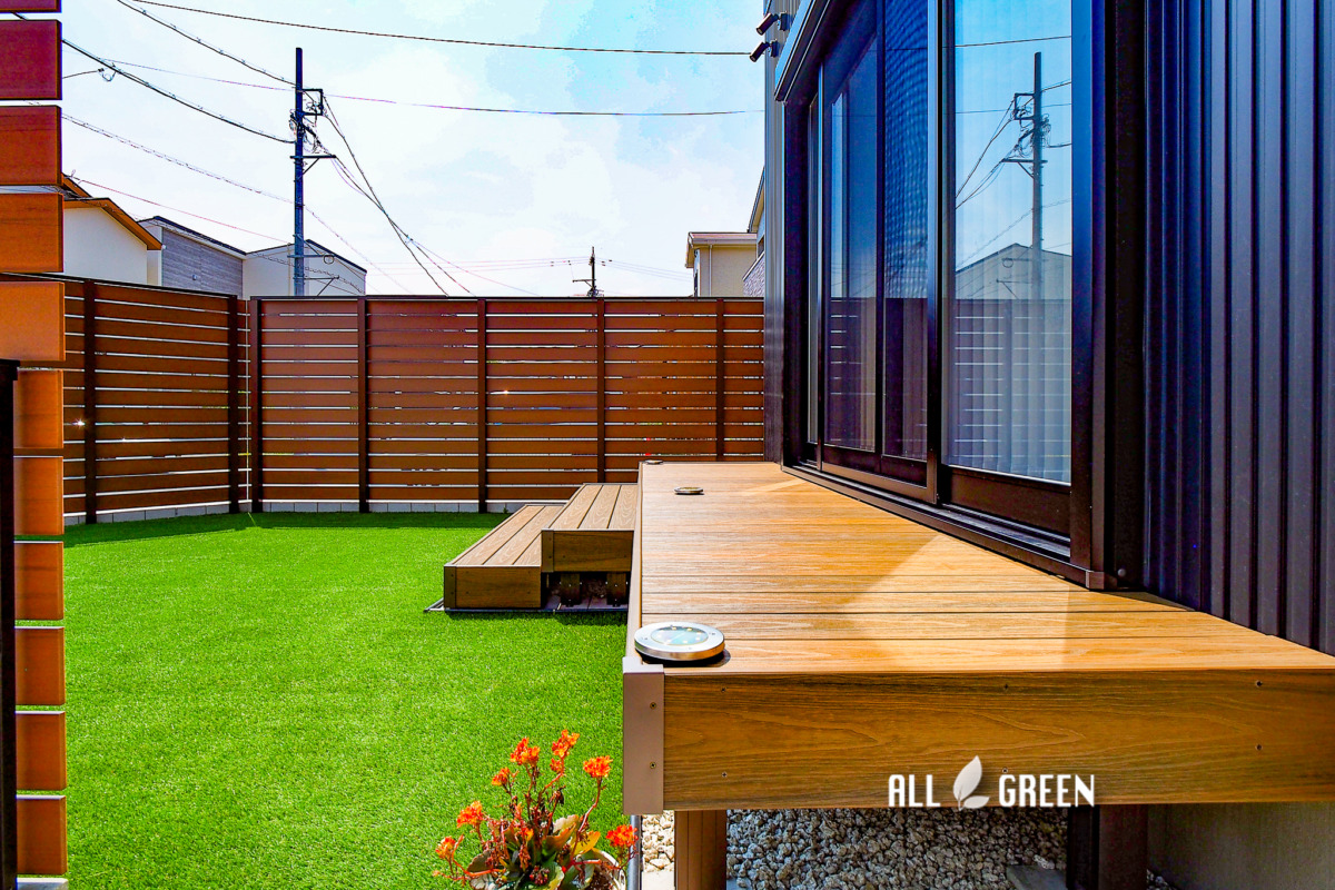 | 外構工事概要 | 清須市F様邸新築外構 ウッドデッキ、目隠しフェンス、人工芝、立水栓、ガーデンパン、照明、植栽 |