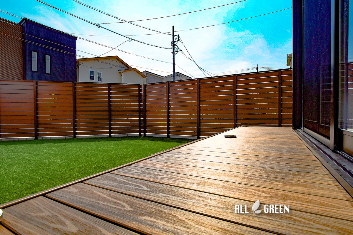 目隠しで囲われたお庭内には、お子様が遊んでいる際、見守ってあげられるような腰掛け程度のウッドデッキが欲しいというお話を頂いていたので、タカショーのエバーエコウッドリアルというウッドデッキを施工しました。