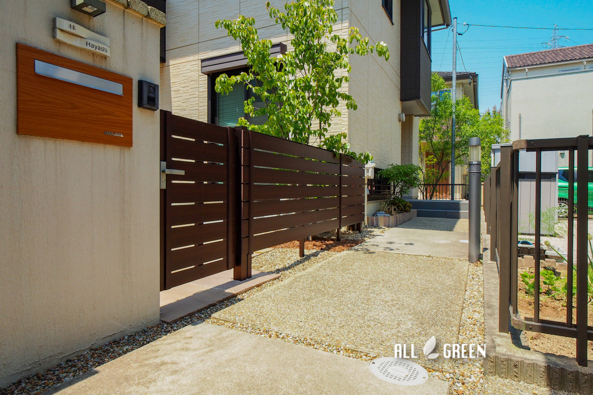門塀横にもワンちゃんが外に飛び出してしまわぬよう、門扉とフェンスを施工し家族時間はもちろん愛犬もニッコリ笑顔が溢れる素敵なお庭に生まれ変わりました。