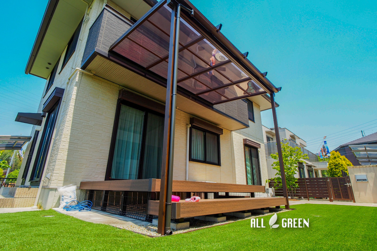 | エクステリア商品 | テラス屋根:三協アルミ ナチュレ Nタイプ/壁付けタイプ/ロング柱 2間×7尺 (本体色/トラッドパイン 屋根材ポリカ色/ブラウンスモーク) ウッドデッキ(人工木):四国化成 ファンデッキHG (本体色/ウォールナット アルミ材/マットブラウン) オプション:段床/間口3200×板3枚 独立ステップ/1ヶ所 床下メッシュ囲い/東西方向のみ設置 2500×2(ブラック) フェンス:B-life.s Bウッドスタイル(横貼り) H100 L=3.0m 120板 すき間10mm 7枚貼り (板色/ノーブルブラウン アルミ柱色/Mブラウン Lアングル色/オータムブラウン) アルミ枕木材:三協アルミ 70角 2本(トラッドパイン) 片開門扉:B-life.s B門扉タイプAベーシック W700×H1000 内開き(板色/ノーブルブラウン 門柱・アルミ枠/Mブラウン 錠/ステンカラー) |