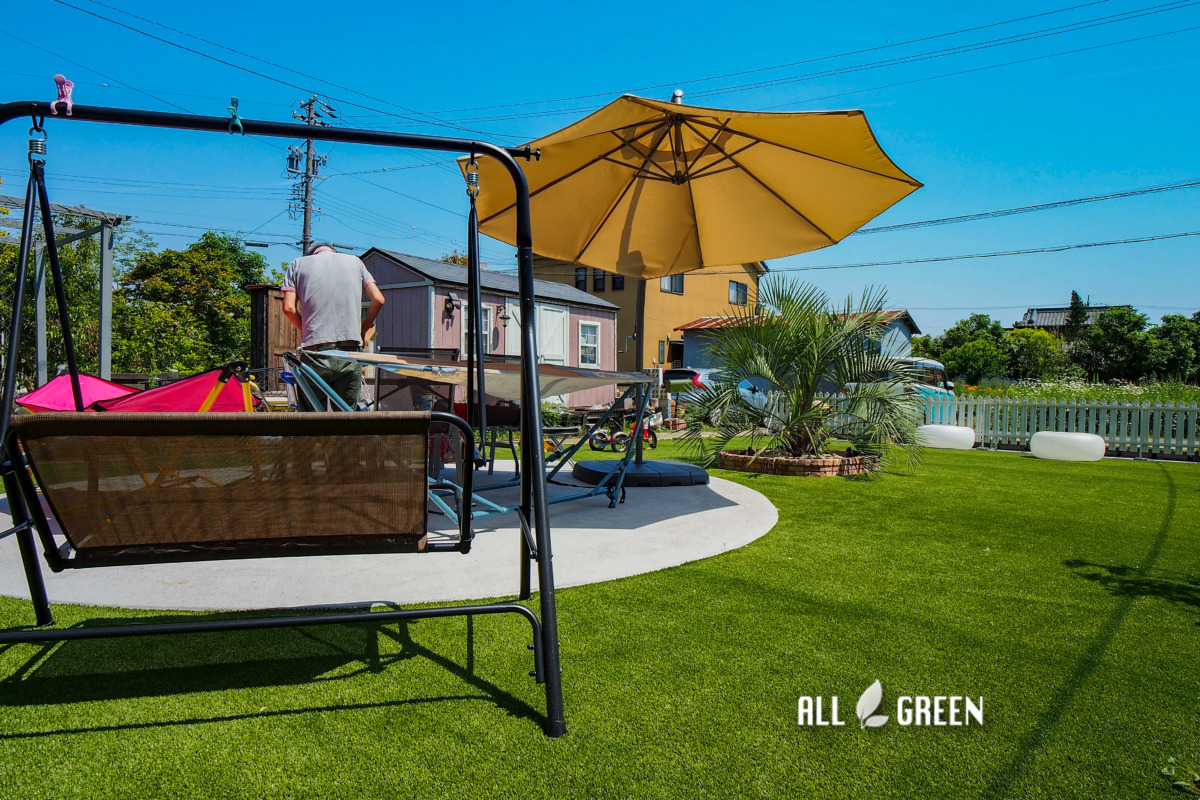 人工芝はクッション性が高いので転んでも怪我になりにくく、小さなお子さんが遊ぶお庭には最適の足場といえます。