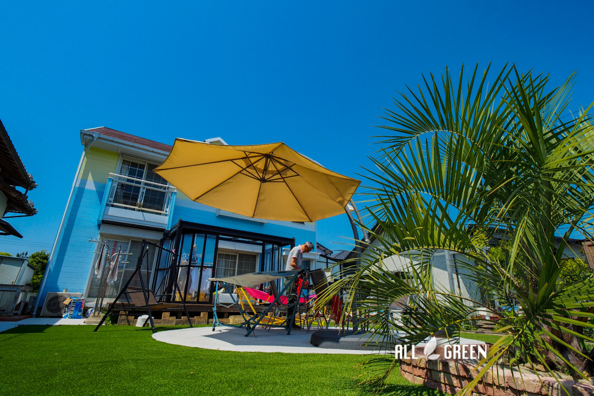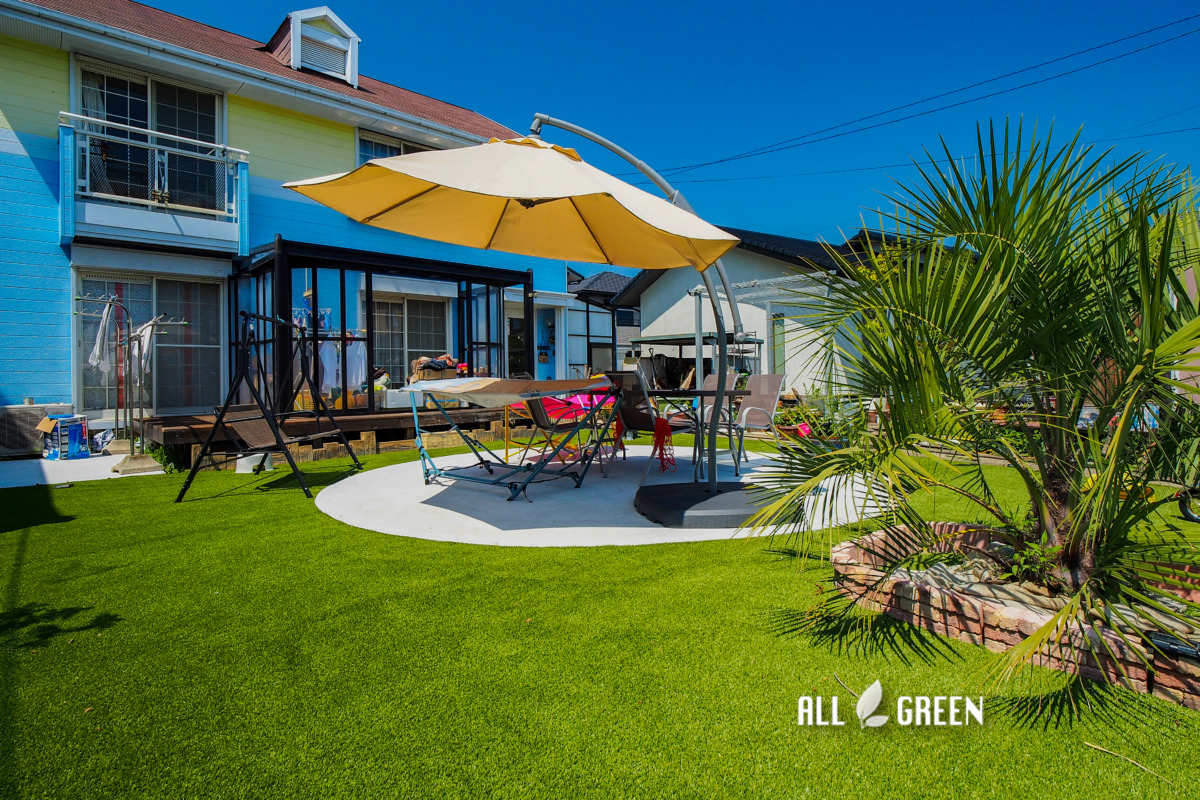 お庭の全面を人工芝にするのではなく、コンクリートをいれてあげることでバーベキューもたのしめるお庭になりました。