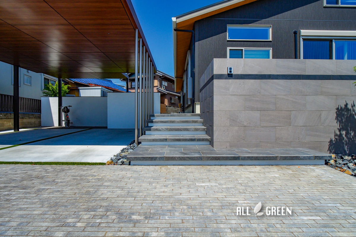 シルバーの丸柱は単なるカーポートの柱としてだけではなく、その横に施工されたアプローチの階段を上る際の手摺りとしての役割も果たしてくれます。