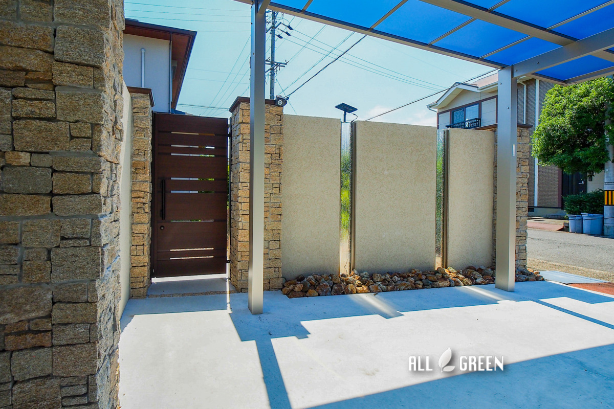 通常シャッターゲートというと、ブロック塀をベースに壁が造られていくイメージですが、今回の施工ではグランドアートウォールを使用し施工しています。