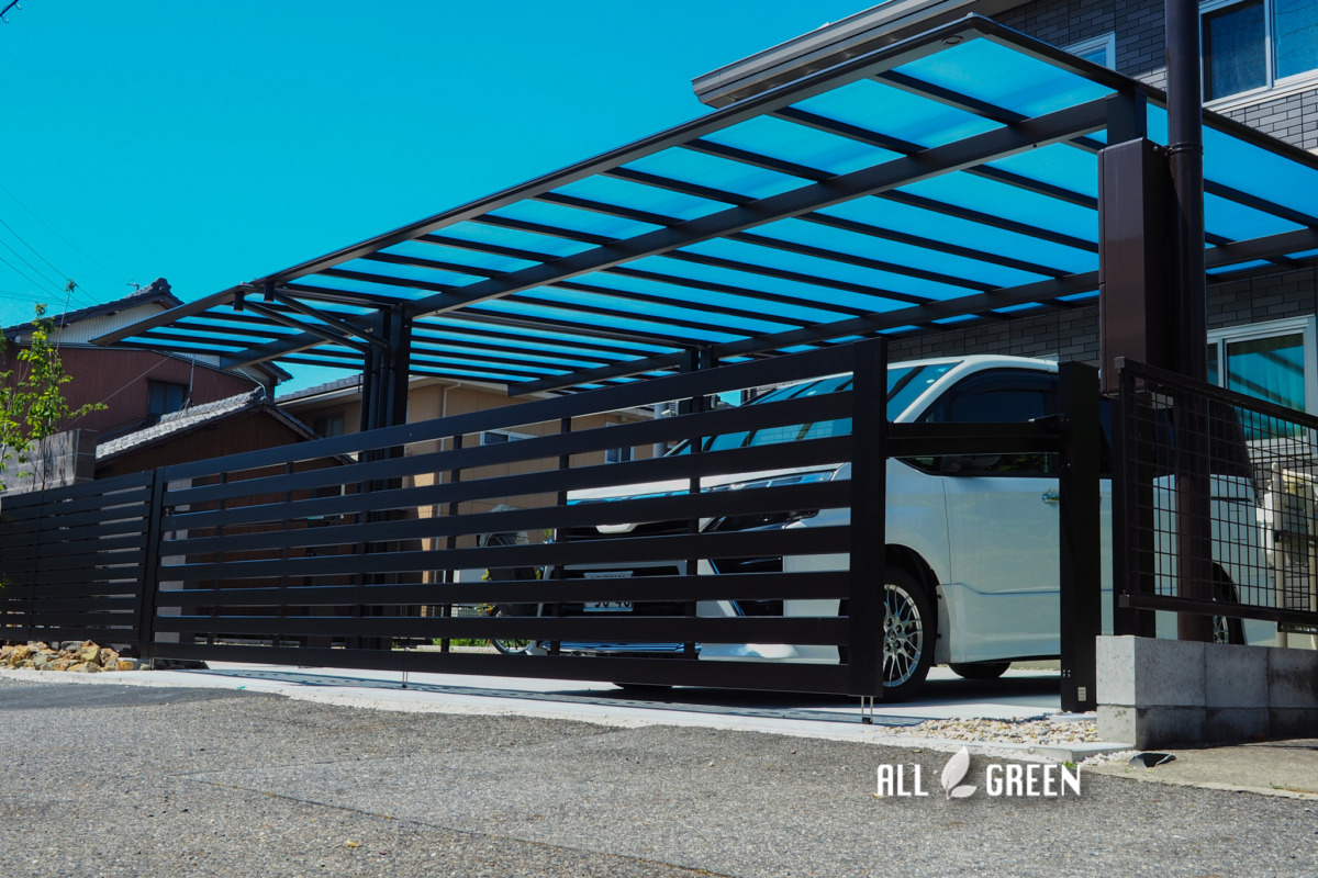 カーポートは両支持タイプのスカイリードの手前に電動の跳ね上げ門扉を施工しており、サイクルポートは片支持タイプのスカイリードの手前に横格子のフェンスを施工しています。