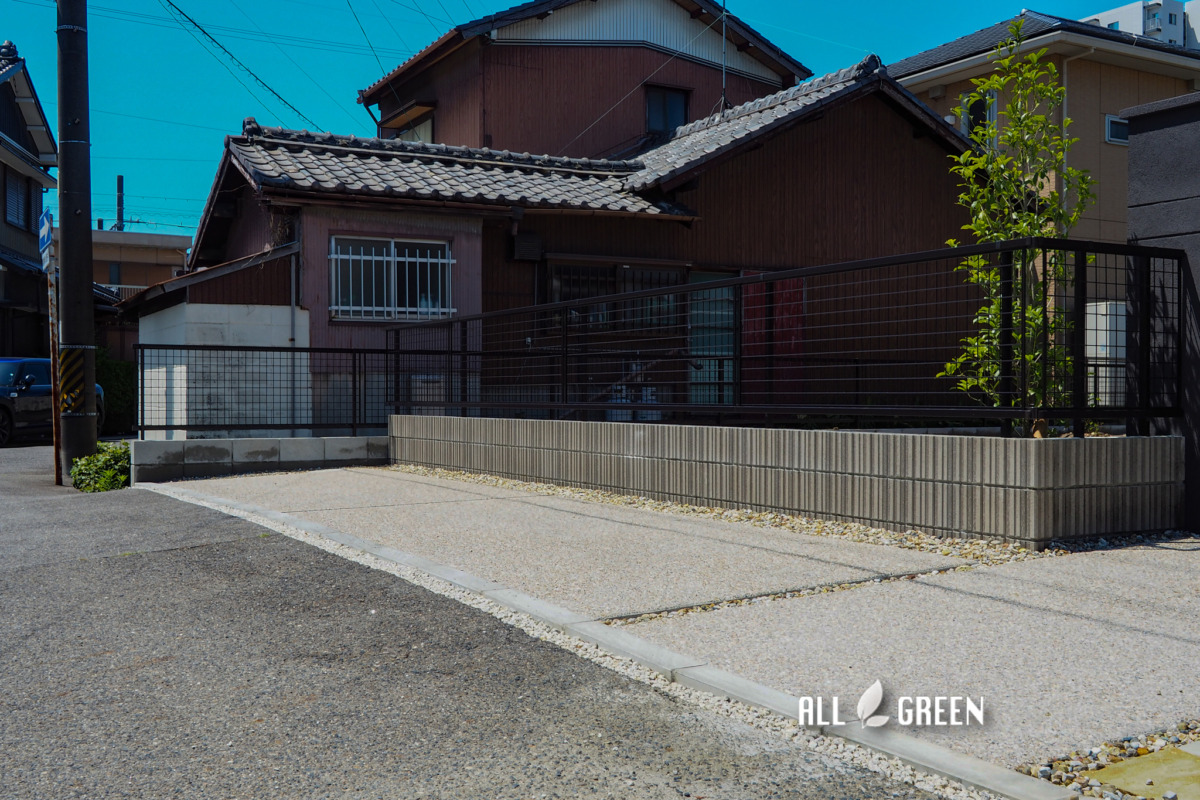 手前に施工した横格子のフェンスも、駐車スペースとして活用するようになった際にすぐ外せるようブロック等は使用せず、比較的すぐにフェンスが取り除けるような施工となっています。