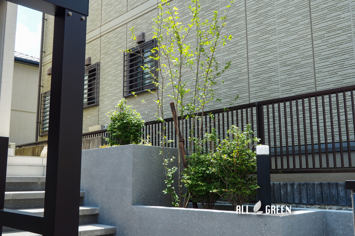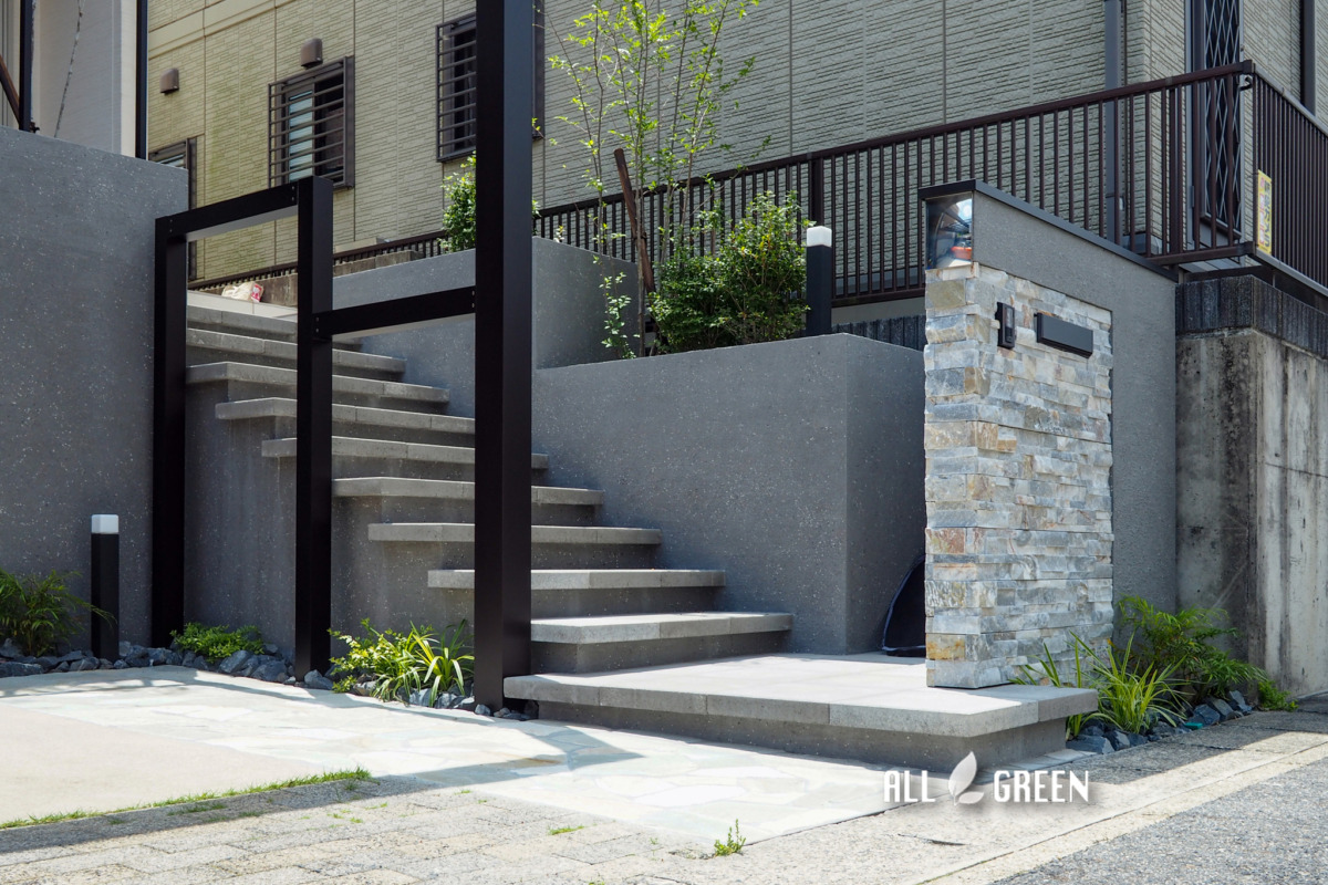 駐車場目地、カーポート、門塀、ポスト、表札、アプローチ、階段、花壇、立水栓、植栽、照明