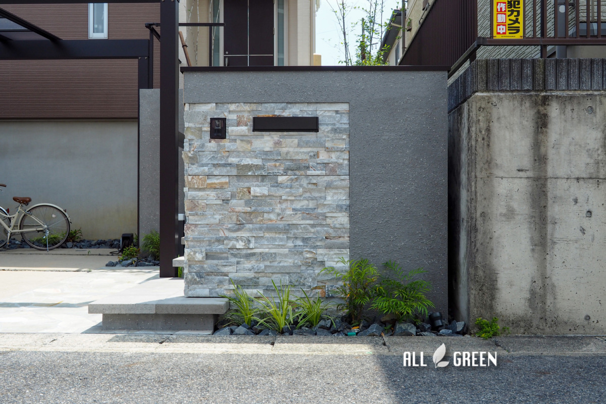 既存の機能門柱を撤去し施工された門塀は、周辺の階段や花壇と合わせた色味の壁を基調にデザイン。