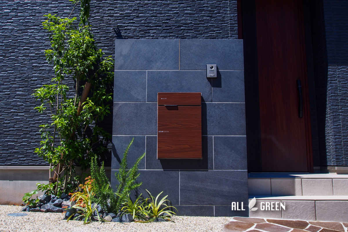 駐車場、アプローチ、門塀、宅配ボックス、表札、ウッドデッキ、目隠しスクリーン、花壇、フェンス、植栽