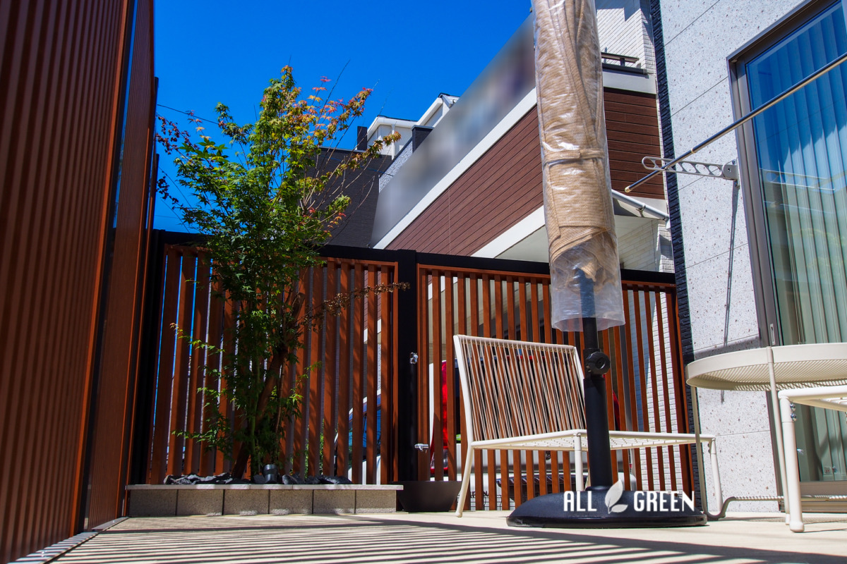 目隠しスクリーン内には、ご要望の一つにもあったガーデニングスペースとしてもご利用いただける人工木デッキを施工しています。