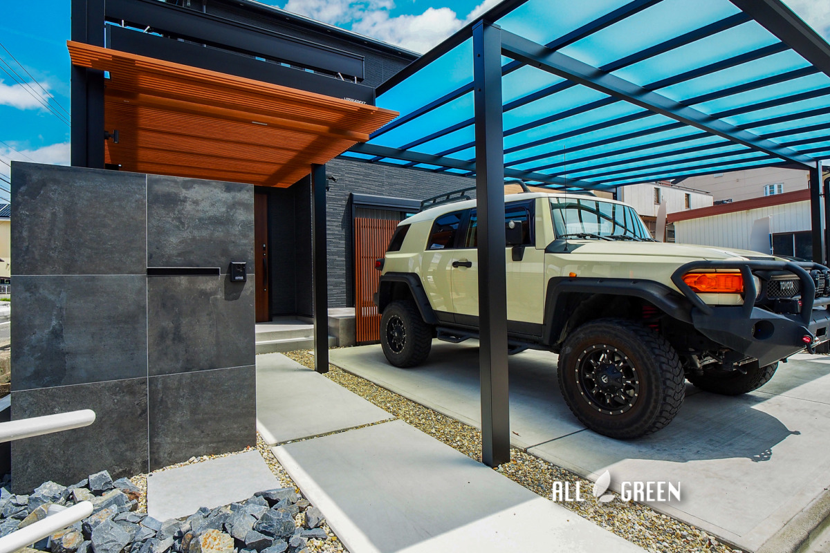 カーポート、アプローチ、ルーフ、門塀、ポスト、タイルテラス、目隠しフェンス、目隠しスクリーン、植栽