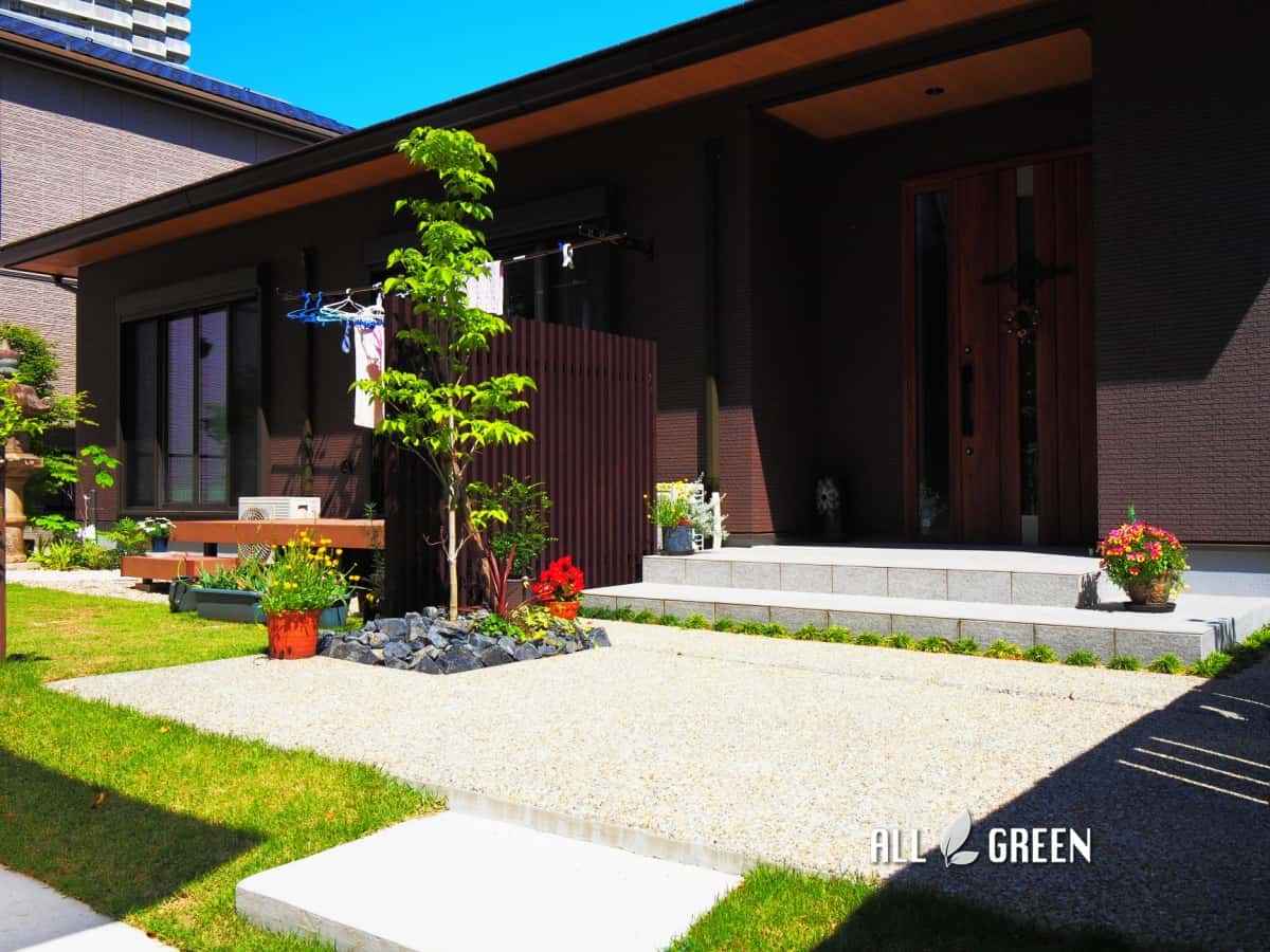 ブラウンを基調とした平屋に見合う外観になるよう木調と植栽でまとめたシンプルモダンの外構。