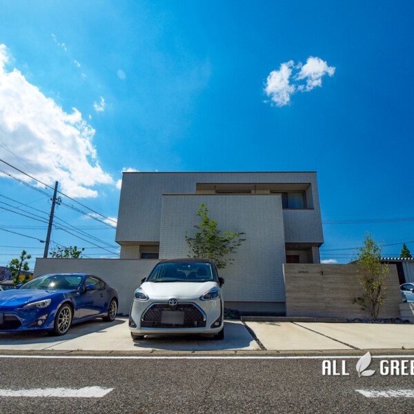 豊田市にあるスタイリッシュで解放感を存分に感じられる新築外構広い敷地に負けない2枚の塀の存在感! 貸駐車場を半分にして、もう半分に新築を建てられたご夫婦。 「シンプルモダン・セミクローズ」がご…