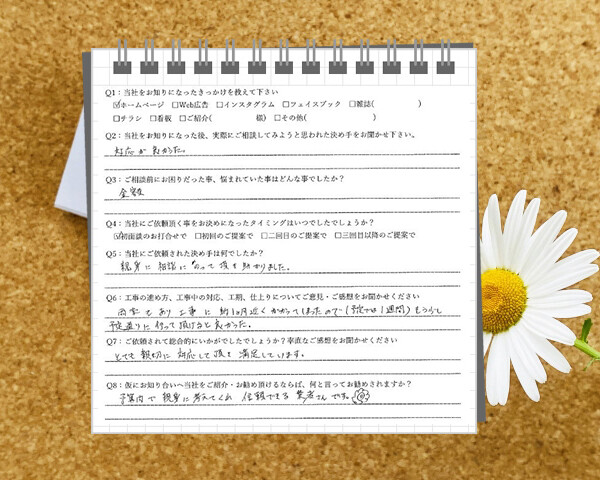 工期が曖昧な部分があったが大変良い仕上りになったと思います。作業員の方の対応がとても丁寧でよかったです。名古屋市北区/T邸Q1:当社をお知りになったきっかけを教えてください ☑ ホームペー…