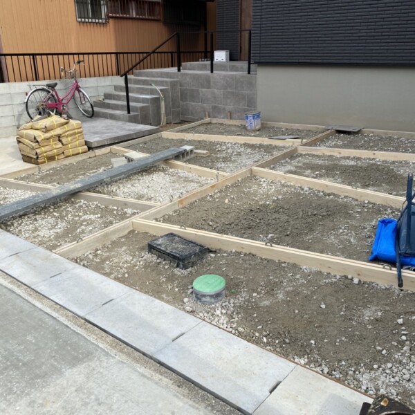 名古屋市名東区K様邸 階段の様子階段のタイルも貼り終わり 手摺り工事となりました。 それと並行して土間の型枠も終わりました。 残すところ門塀タイル…