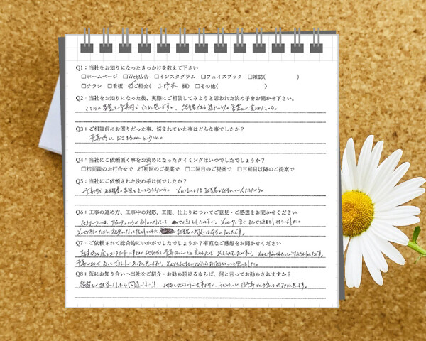 お盆を挟んだため工期が長くなってしまったが、他については問題なし。柔軟な対応について評価したいです。コロナ対応も◎大府市/H邸Q1:当社をお知りになったきっかけを教えてください ☑ ホームペー…