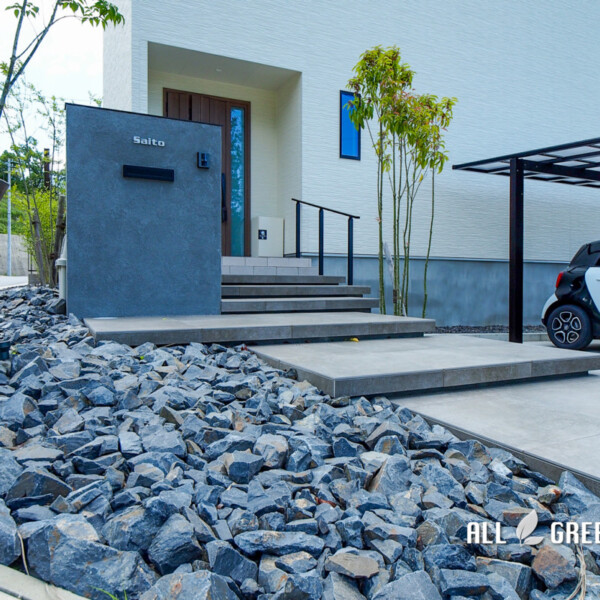 長久手市にある新築はモノトーンでまとめたシンプルモダン外構フラットなデザインの邸宅にあわせた外構デザイン 弊社ホームページよりお問合せいただき「どんなデザインができるのか知りたくて」とご相談…