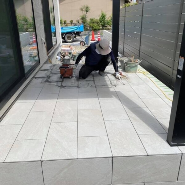 大府市K様邸 タイルデッキの様子タイルデッキが貼り終わりました。 目地材を込めてデッキの完了です。 あとは土間コンクリート、植栽で完了です。 お天…