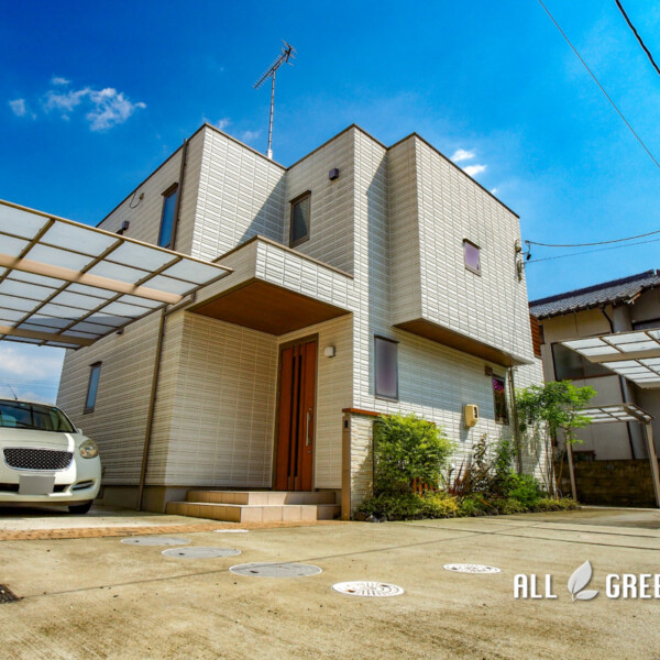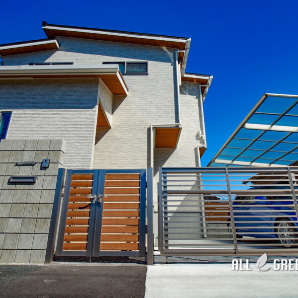 ホワイトの外壁にブラウンの差し色がおしゃれな名古屋市中川区の新築外構メーカーやカラーを合わせることで統一感を演出 軒天のブラウンがチラッと覗く柔らかい雰囲気の邸宅。 新築外構一式を弊社にて施工させてい…