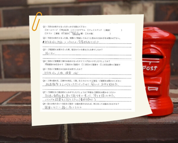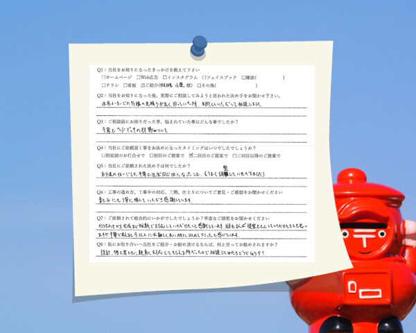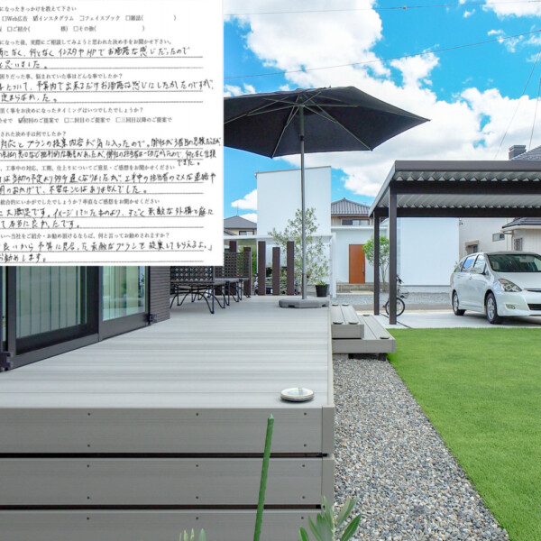 こちらの要望に対して答えを探してくれなど一緒に考えてくれました。経過報告もしてもらい安心してお任せ出来ました。岐阜県本巣市/H邸Q1:当社をお知りになったきっかけを教えてください ☑ 紹介…