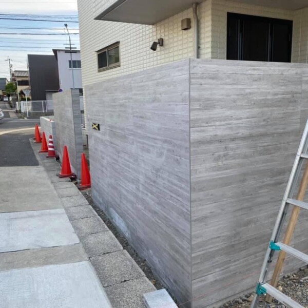 名古屋市天白区T様邸 壁のタイルの様子塀のタイルがだいぶ進んできました。 今回は杉板模様の大判タイルです。 迫力がありますね。 30cmx1.2m の大…