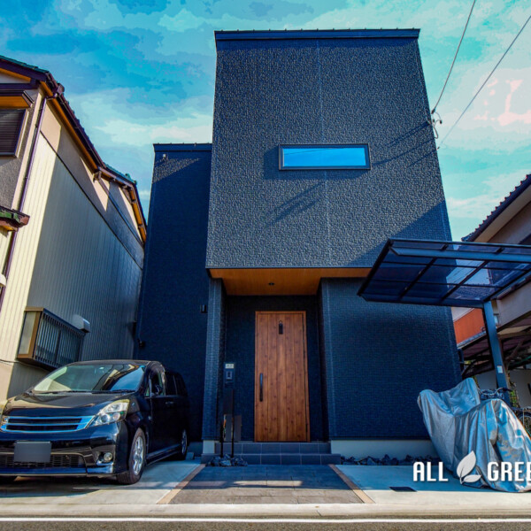 清須市にあるマットブラックでまとめたシンプルモダンな新築外構黒で統一されたモダンなオープン外構 メールにてお問合せをいただきご来店くださったご家族。 横支持タイプの1台用カーポートを付けたいと…